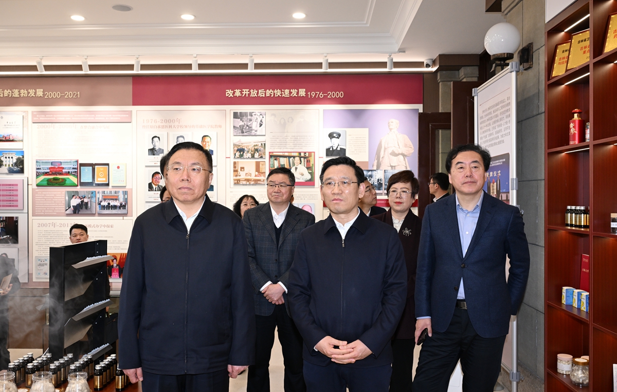 郭灵计一行走进吉林大学人参研究院,参观院史馆,详细了解人参药理机制研究和人参在创新药物、保健食品、化妆品等领域的研发应用情况。他指出,吉林作为人参产量第一大省,必须主动担当、扛起责任,推动人参产业高质量发展,希望双方发挥各自优势,加快人参多领域多元化开发利用,持续提高人参产业效益和产品附加值,推动吉大科技成果在吉林高质量转化。