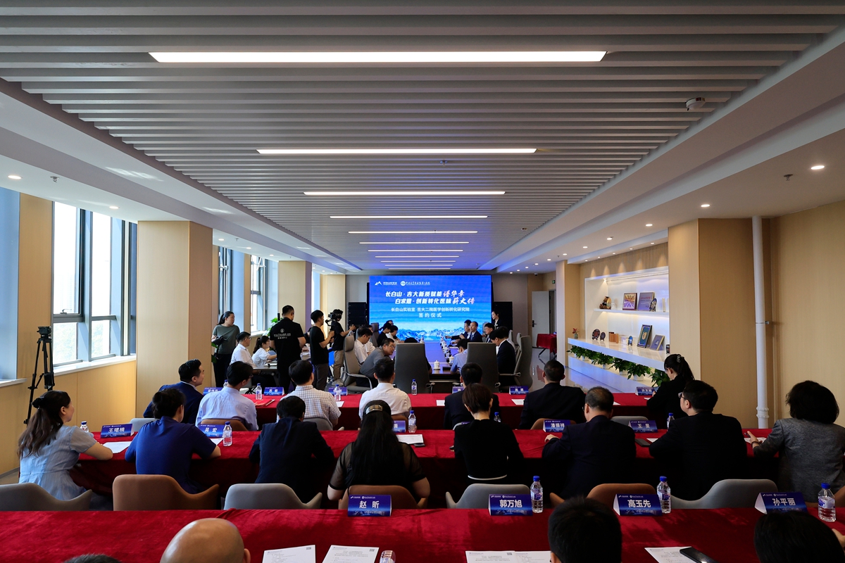 签约仪式上,在张希、付帅等领导的见证下,长白山实验室常务副主任周强与王海峰代表双方签署合作共建协议。